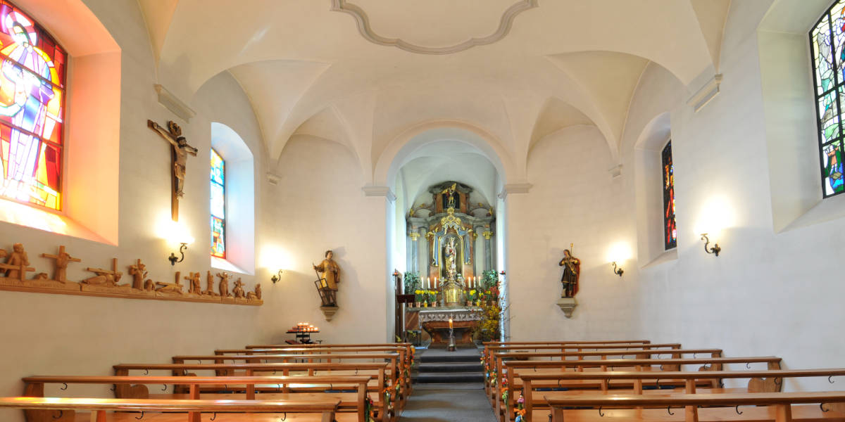 Später baute man daneben ein Hotel. Die erste Kapelle wurde 1585 eingeweiht. Im Jahre 1779 liess Ammann Justus Zimmermann die Kapelle abbrechen und an ihrer Stelle durch Architekt Jakob Singer einen Neubau errichten. Bei der Renovation 1949/50 blieb nur der Hochaltar erhalten. Der Altaraufbau schafft den würdigen Rahmen für den Tabernakel mit den köstlichen Putten-Engeln, für die Marienstatue, um 1500 geschnitzt von einem unbekannten Künstler, und für die Statue des Erzengels Michael, des Patrons der Kapelle. An Stelle der Seitenaltäre stehen zwei barocke Statuen auf Konsolen, links der heilige Diakon Laurentius mit dem Rost, dem Attribut seines Martyriums, rechts der heilige Wendelin, Patron der Hirten. Schon seit jeher pilgerte man nicht nur zur kristallklaren Quelle, sondern auch zur «mildreichen Mutter Mariae Gnadenthron». Die Farbfenster mit dem heiligen Bruder Klaus, der Gottesmutter mit Kind, mit Christus und dem ungläubigen Thomas und dem heiligen Christophorus, stammen von verschiedenen Künstlern.